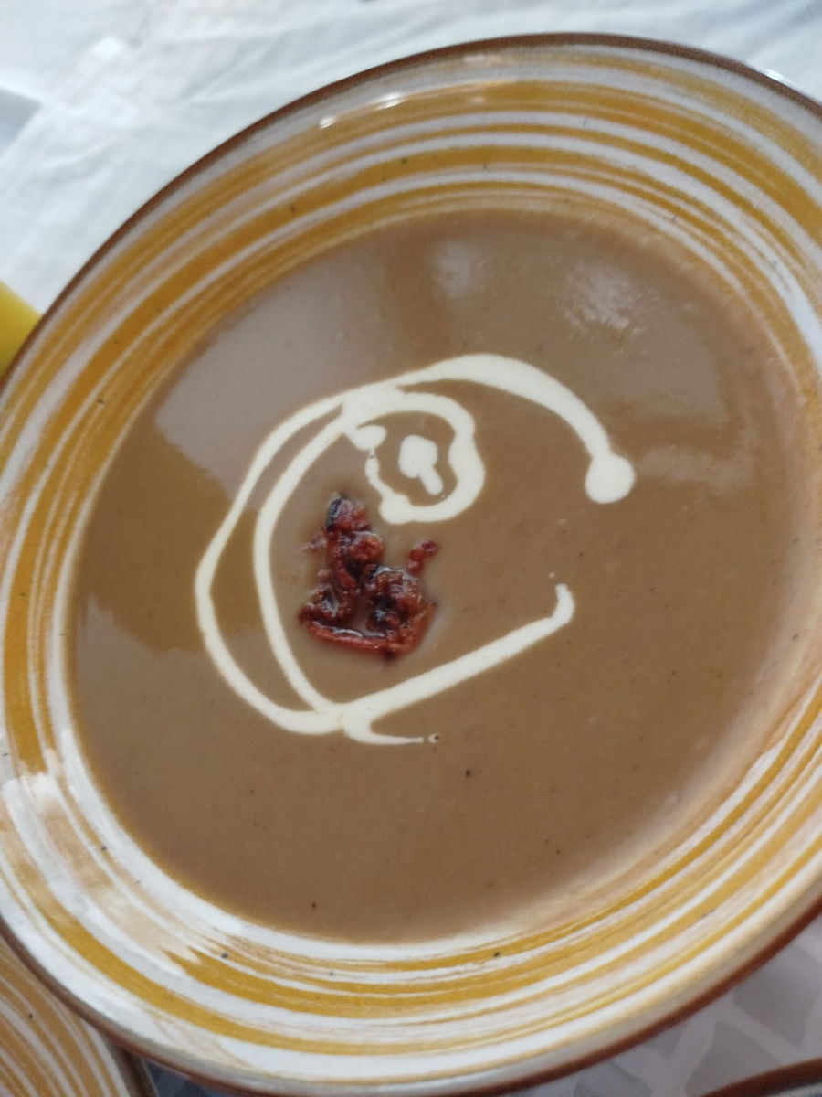 - Polévka: Krém z pečených rajčat s bazalkovým pestem