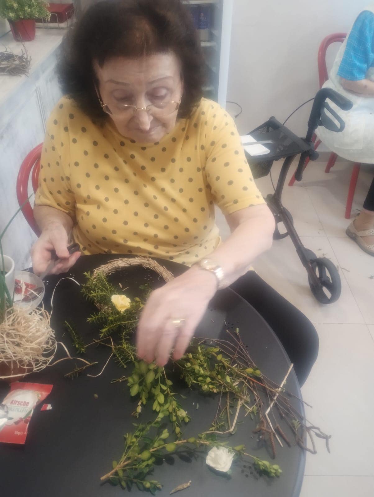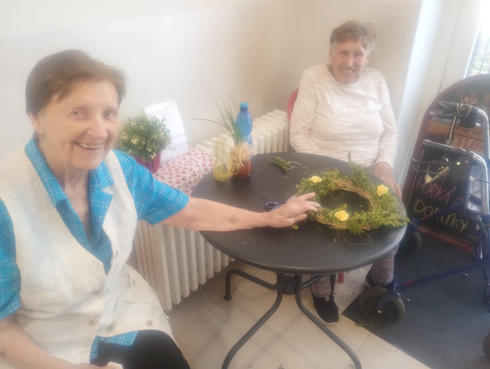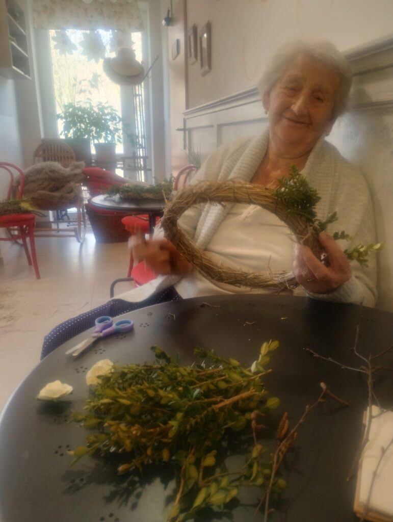 Proces Plný Zábavy a Humoru: Barevné prsty a občasný smích nevyhnutelně patří k tvorbě věnců. Senioři si vychutnávají každou chvíli a neberou to příliš vážně. Vytváření věnců se stává spíše příležitostí k relaxaci a odpočinku než povinností.