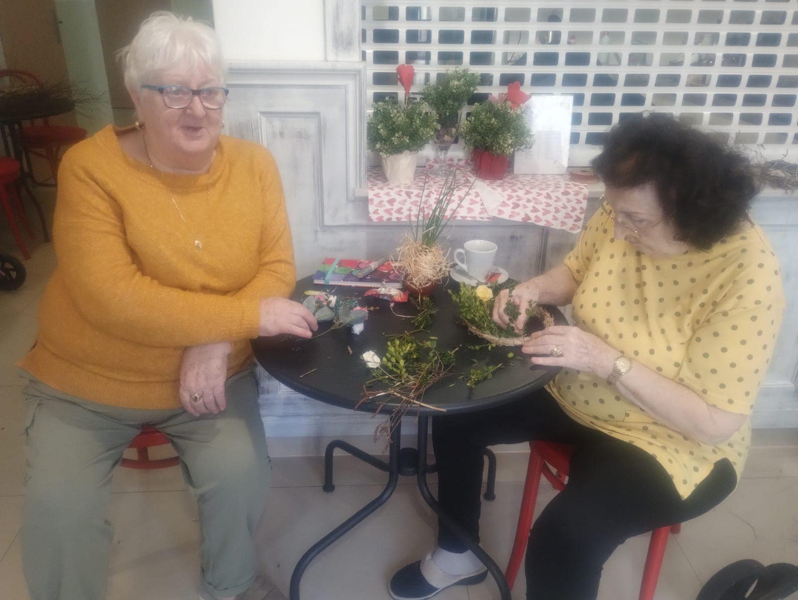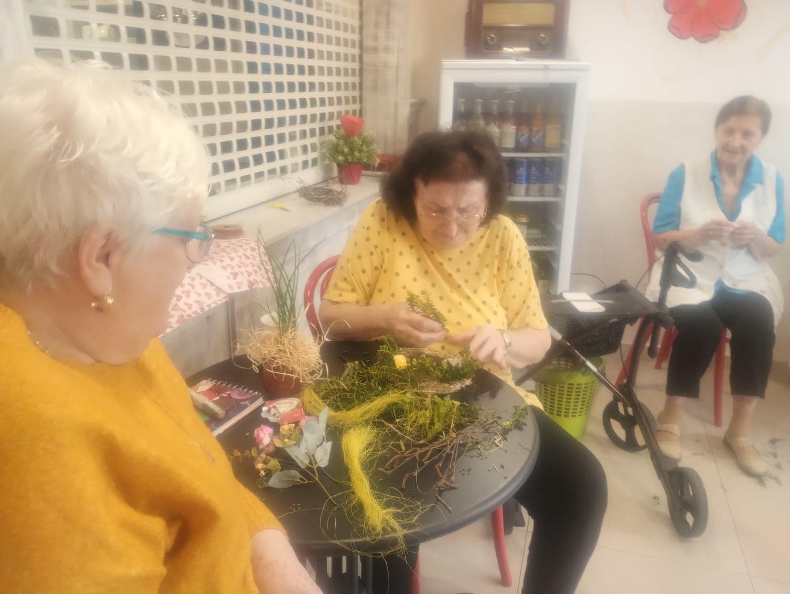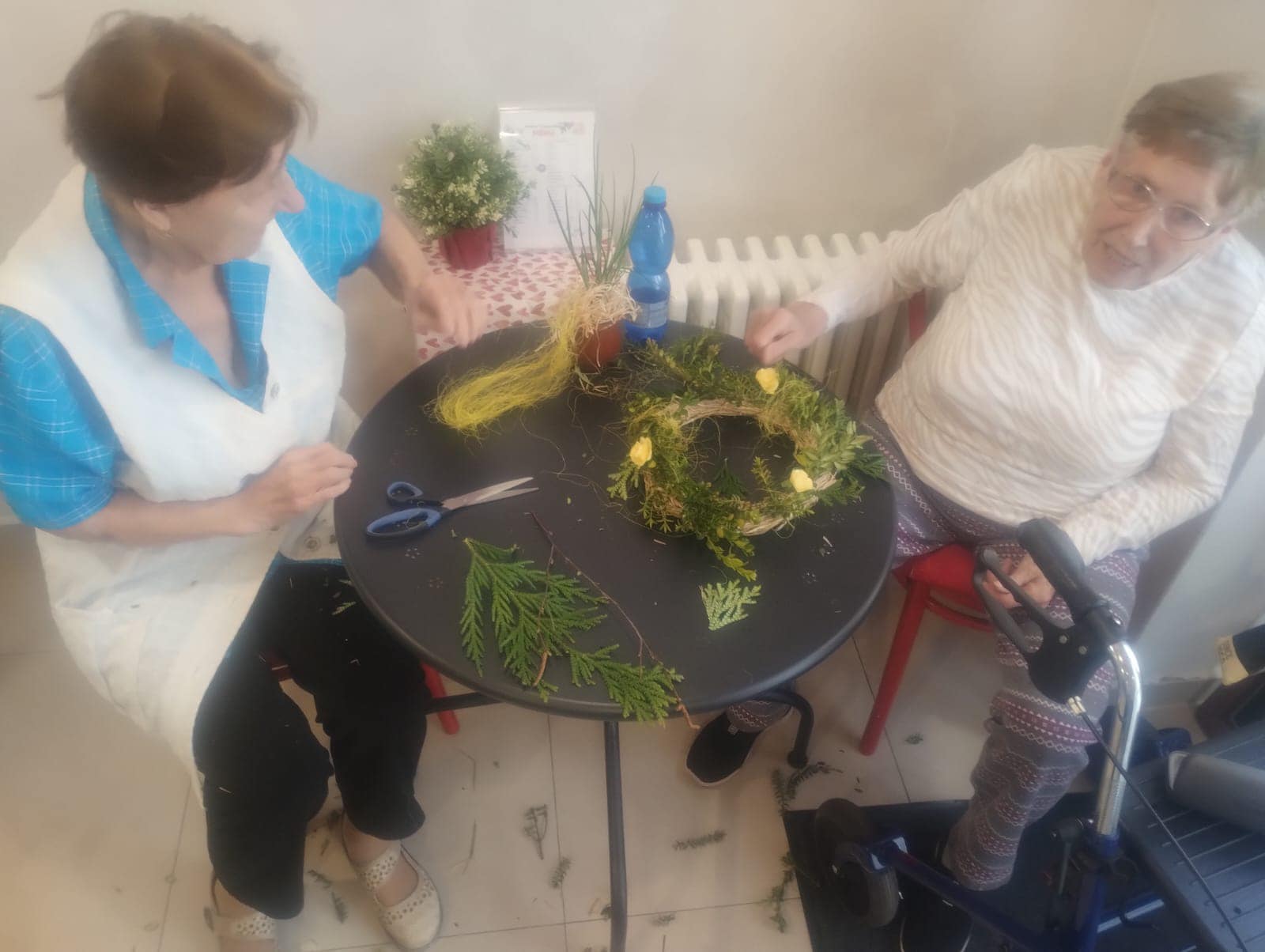 Proces Plný Zábavy a Humoru: Barevné prsty a občasný smích nevyhnutelně patří k tvorbě věnců. Senioři si vychutnávají každou chvíli a neberou to příliš vážně. Vytváření věnců se stává spíše příležitostí k relaxaci a odpočinku než povinností.