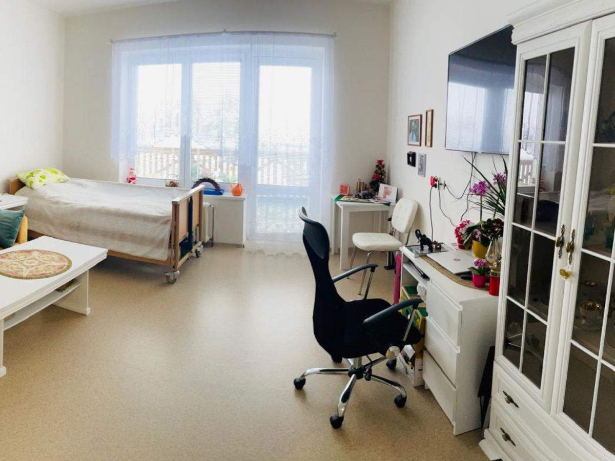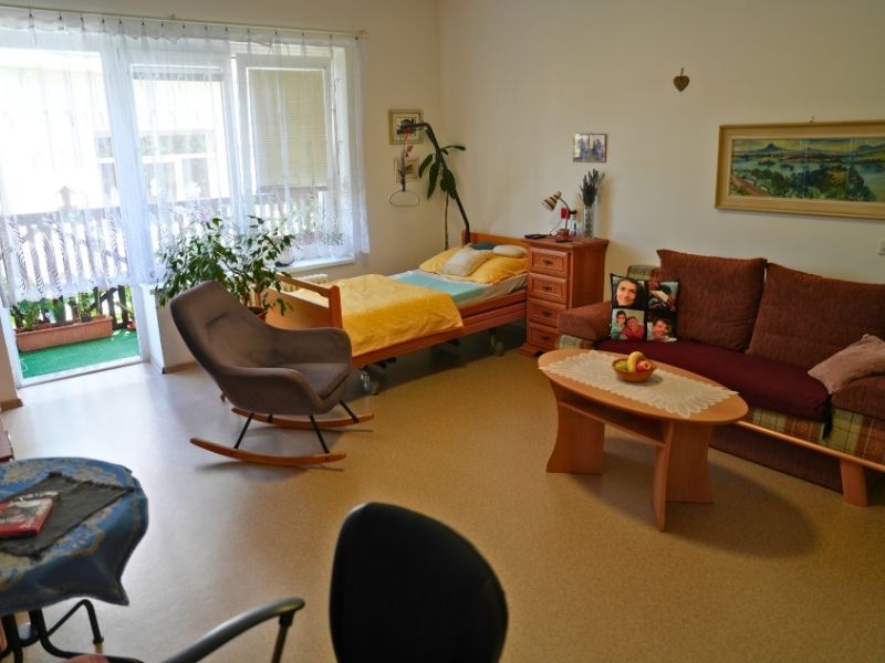 - Pokoje jsou přizpůsobeny potřebám našich klientů a jsou vybaveny polohovacím lůžkem a signalizačním systémem pro okamžité přivolání pomoci našeho ošetřovatelského týmu.