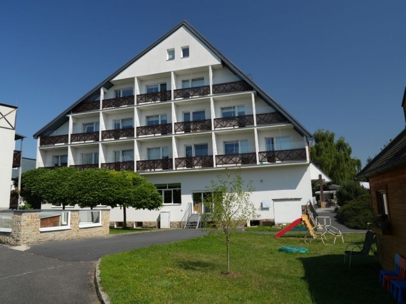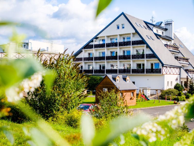 V budově C najdete kavárnu s krásným výhledem na Krušné hory, ideální místo pro relaxaci i chvíle s rodinou.