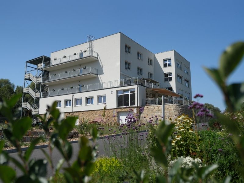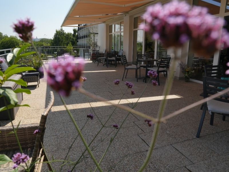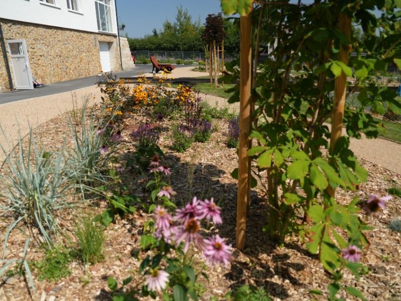 Zeleň, květinové záhony a pohodlný mobiliář vytvářejí přívětivé prostředí nejen pro naše klienty, ale i jejich rodiny a přátele. Zahrada je bezbariérová a dostupná po celý den – protože víme, že spojení s přírodou léčí tělo i duši.